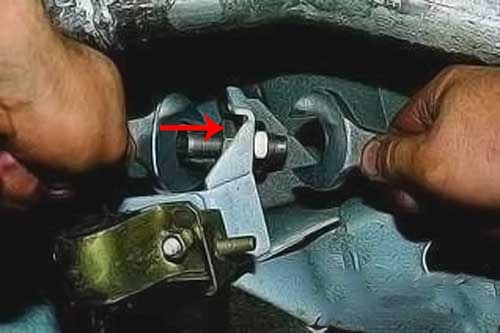 Далее берем рожковый ключ на 19, отворачиваем болт переднего крепления растяжки и снимаем ее