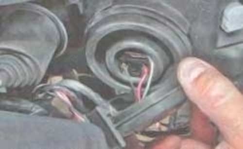 Далее поднимаем капот, снимаем крышку фары и колодку с лампы ближнего света